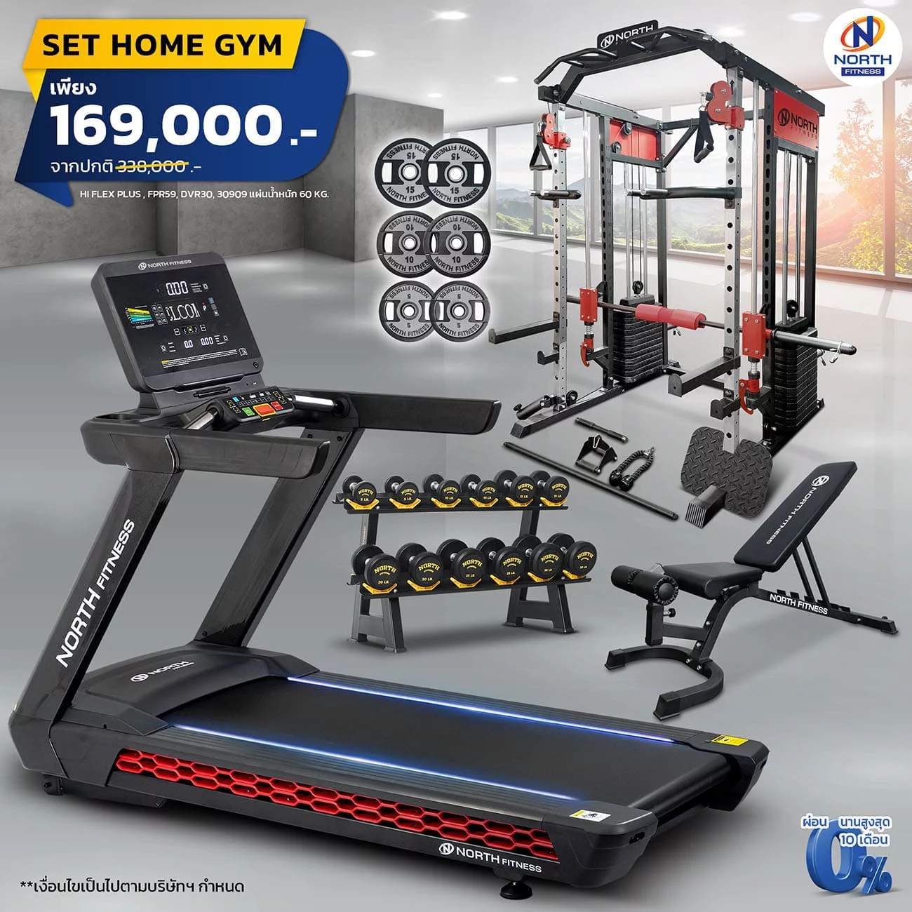 ชุดโฮมยิมจัดเซตสุดคุ้ม ประกอบไปด้วย ชุดเซตโฮมยิม ลู่วิ่ง HI-FLEX PLUS+สมิท แมชชีน FPR59+ดัมเบลเซต DVR30+ม้านั่ง 30909+แผ่นน้ำหนัก 60 Kg. ราคา 169,000 บาท