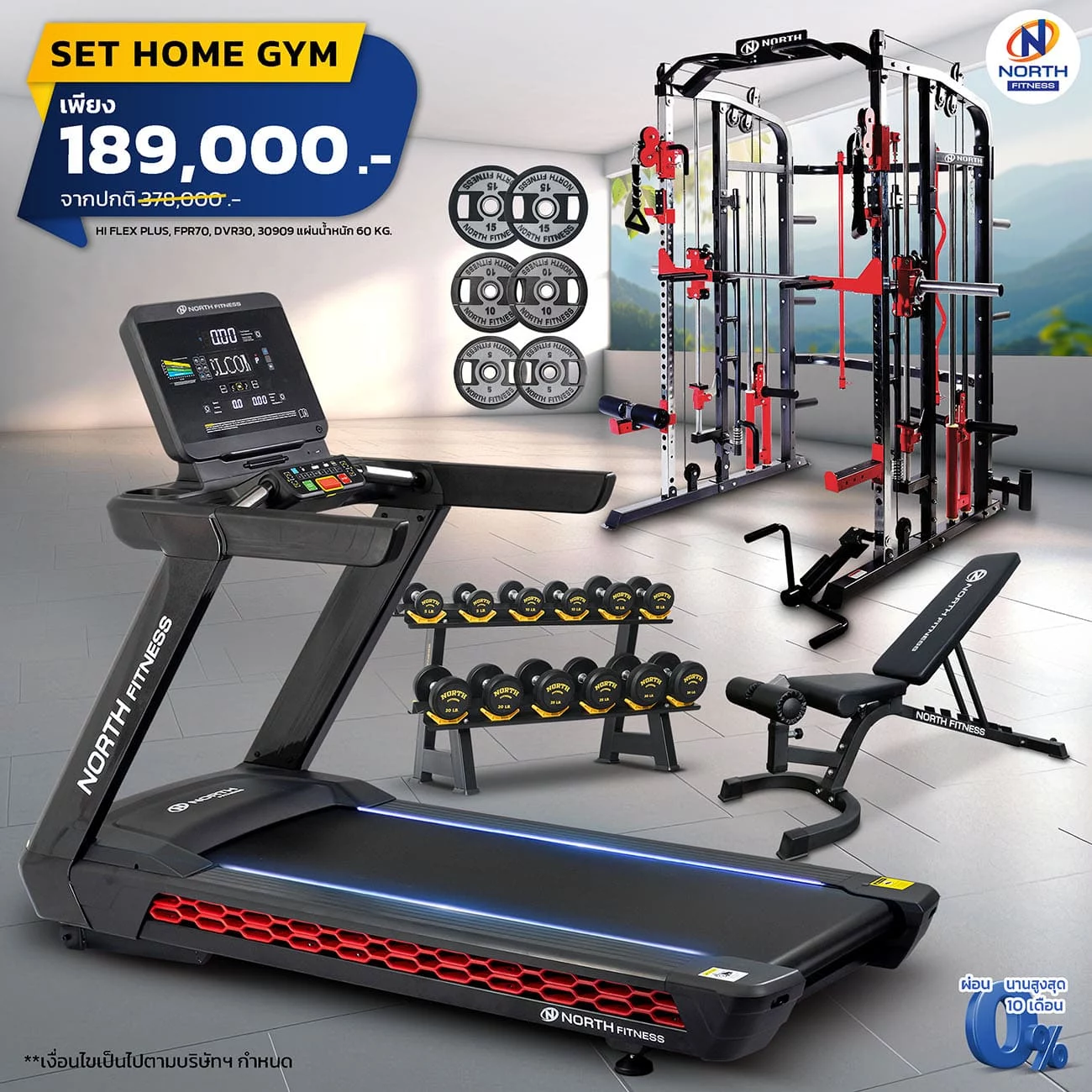ชุดโฮมยิมจัดเซตสุดคุ้ม ประกอบไปด้วย ชุดเซตโฮมยิม ลู่วิ่ง HI FLEX PLUS+สมิท แมชชีน FPR70+ดัมเบลเซต DVR30+ม้านั่ง 30909+แผ่นน้ำหนัก 60 Kg. ราคา 189,000 บาท