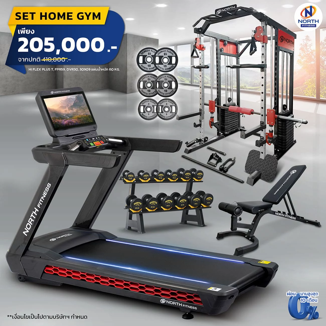 ชุดโฮมยิมจัดเซตสุดคุ้ม ประกอบไปด้วย ชุดเซตโฮมยิม ลู่วิ่ง HI-FLEX PLUS T+สมิท แมชชีน FPR59+ดัมเบลเซต DVR30+ม้านั่ง 30909+แผ่นน้ำหนัก 60 Kg. ราคา 205,000 บาท