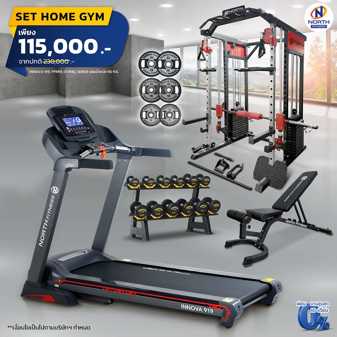 ชุดโฮมยิมจัดเซตสุดคุ้ม ประกอบไปด้วย ชุดเซตโฮมยิม ลู่วิ่ง INNOVA919+สมิท แมชชีน FPR59+ดัมเบลเซต DVR30+ม้านั่ง 30909+แผ่นน้ำหนัก 60 Kg. ราคา 115,000 บาท