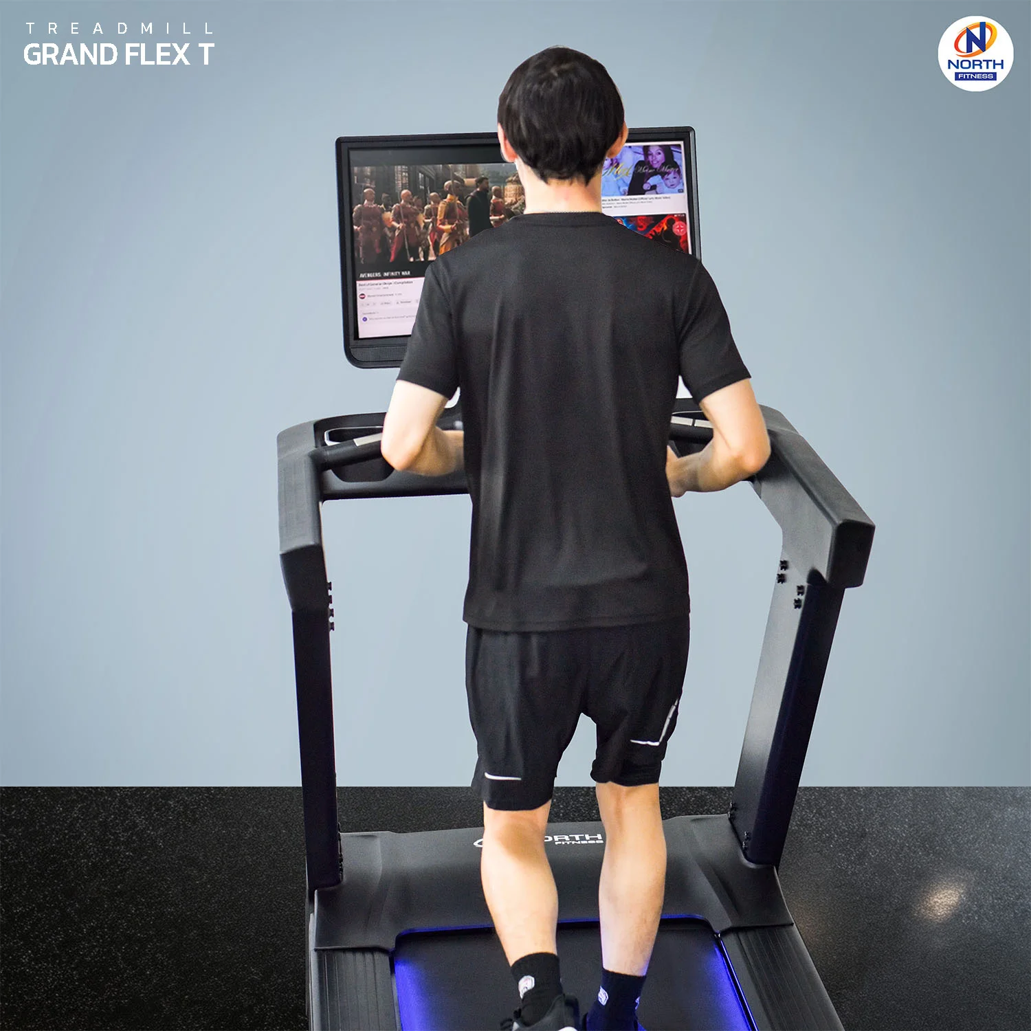 ลู่วิ่งไฟฟ้า North Fitness รุ่น GRAND FLEX T ลู่วิ่งไฟฟ้ารุ่นใหม่ล่าสุด หน้าจอแสดงผล Touch Screen 27 นิ้ว พร้อมกับ Design ใหม่เสริมไฟ LED ใต้ที่พักเท้า มีระบบชาร์ทแบตเตอรีโทรศัพท์ Smart Phone แบบไร้สายเหมาะสำหรับทุกคนที่อยากออกกำลังกายที่บ้านแบบสะดวกสบาย สามารถเชื่อมต่อ WIFI เพื่อใช้งาน Application ต่างๆได้ ระบบรองรับแรงกระแทก 8 จุด เพิ่มความปลอดภัยด้วย Safety Key ที่หยุดฉุกเฉินทันทีหากเกิดเหตุการณ์ไม่คาดคิด มีระบบวัดชีพจรจากที่จับมือให้คุณเช็คอัตราการเต้นของหัวใจได้ตลอดไม่ว่าจะวิ่งเบาๆ หรือฝึกหนัก ทำให้การวิ่งของคุณมีประสิทธิภาพมากยิ่งขึ้น